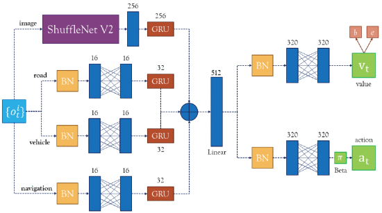 In this work, we combine Curriculum Learning with Deep Reinforcement Learning to learn without any prior domain knowledge, an end-to-end competitive driving policy for the CARLA autonomous driving simulator. To our knowledge, we are the first to provide consistent results of our driving policy on all towns available in CARLA. Our approach divides the reinforcement learning phase into multiple stages of increasing difficulty, such that our agent is guided towards learning an increasingly better driving policy. The agent architecture comprises various neural networks that complements the main convolutional backbone, represented by a ShuffleNet V2. Further contributions are given by (i) the proposal of a novel value decomposition scheme for learning the value function in a stable way and (ii) an ad-hoc function for normalizing the growth in size of the gradients. We show both quantitative and qualitative results of the learned driving policy.