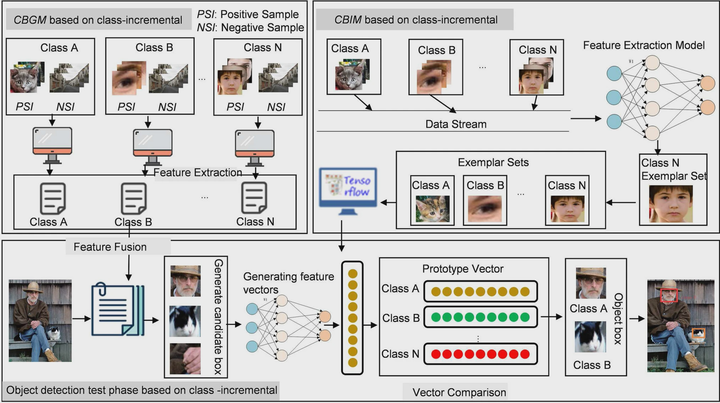 Object detection has been widely used in intelligent video surveillance, robot navigation, industrial detection, and other fields. Object detection can effectively reduce the consumption of human capital and has important practical significance. However, the existing object detection methods lack adaptability to the application environment and need to obtain all images classes at one time to train the model in a static setting, and do not support the incremental learning. Therefore, we propose a novel Class-Incremental Object Detection (CIOD) framework based on deep learning. CIOD divides object detection into two stages:object candidate box generation and selection. In the first stage, we improved the traditional OpenCV cascaded classifier to adapt to class-incremental learning while maintaining accuracy. In the second stage, we use example sets and prototype vectors to construct a class increment-based classifier to identify the generated object candidate box. We verify the effectiveness of the proposed method in terms of object detection effect, efficiency, and memory capacity. Experimental results show that CIOD can detect object in a class-incremental manner and can control the memory capacity not to increase with the number of newly increased classes.