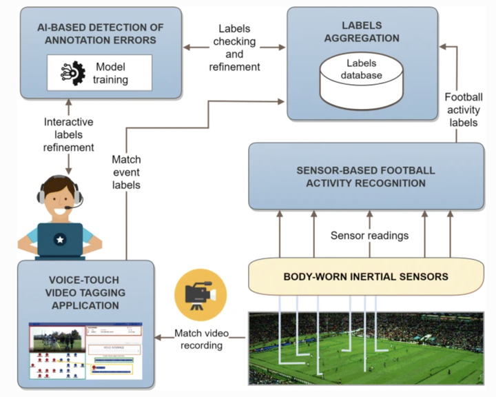 In the last years, scientific and industrial research has experienced a growing interest in acquiring large annotated data sets to train artificial intelligence algorithms for tackling problems in different domains. In this context, we have observed that even the market for football data has substantially grown. The analysis of football matches relies on the annotation of both individual players’ and team actions, as well as the athletic performance of players. Consequently, annotating football events at a fine-grained level is a very expensive and error-prone task. Most existing semi-automatic tools for football match annotation rely on cameras and computer vision. However, those tools fall short in capturing team dynamics and in extracting data of players who are not visible in the camera frame. To address these issues, in this manuscript we present FootApp, an AI-based system for football match annotation. First, our system relies on an advanced and mixed user interface that exploits both vocal and touch interaction. Second, the motor performance of players is captured and processed by applying machine learning algorithms to data collected from inertial sensors worn by players. Artificial intelligence techniques are then used to check the consistency of generated labels, including those regarding the physical activity of players, to automatically recognize annotation errors. Notably, we implemented a full prototype of the proposed system, performing experiments to show its effectiveness in a real-world adoption scenario.