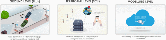 Since their appearance, Smart Cities have aimed at improving the daily life of people, helping to make public services smarter and more efficient. Several of these services are often intended to provide better security conditions for citizens and drivers. In this vein, we present Heimdall, an AI-based video surveillance system for traffic monitoring and anomalies detection. The proposed system features three main tiers:a ground level, consisting of a set of smart lampposts equipped with cameras and sensors, and an advanced AI unit for detecting accidents and traffic anomalies in real time; a territorial level, which integrates and combines the information collected from the different lampposts, and cross-correlates it with external data sources, in order to coordinate and handle warnings and alerts; a training level, in charge of continuously improving the accuracy of the modules that have to sense the environment. Finally, we propose and discuss an early experimental approach for the detection of anomalies, based on a Faster R-CNN, and adopted in the proposed infrastructure.