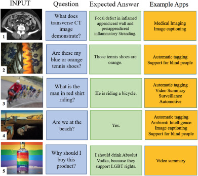 Visual Question Answering (VQA) is an extremely stimulating and challenging research area where Computer Vision (CV) and Natural Language Processig (NLP) have recently met. In image captioning and video summarization, the semantic information is completely contained in still images or video dynamics, and it has only to be mined and expressed in a human-consistent way. Differently from this, in VQA semantic information in the same media must be compared with the semantics implied by a question expressed in natural language, doubling the artificial intelligence-related effort. Some recent surveys about VQA approaches have focused on methods underlying either the image-related processing or the verbal-related one, or on the way to consistently fuse the conveyed information. Possible applications are only suggested, and, in fact, most cited works rely on general-purpose datasets that are used to assess the building blocks of a VQA system. This paper rather considers the proposals that focus on real-world applications, possibly using as benchmarks suitable data bound to the application domain. The paper also reports about some recent challenges in VQA research.